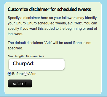 Here is to allow you to add special text in your tweet to identity the automated tweet is from Churp’s Ads. You can choose it to appear infront or behind the text. By default is “Ad:”, then here I changed it to “ChurpAd:”. So when people saw my twitter with “ChurpAd: xxxxx”, at least they know it is from Churp Churp.