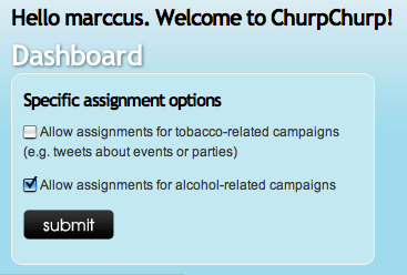 for current layout, after logged in, goto “Dashboard”, then at the left sidebar you can see “Authorization Status” section. click on the Twitter’s one, logged in with your twitter account and allow churpchurp to authorize your twitter account. Then it’s done. Let me know if it cant work, so that I might able to help abit bit =P