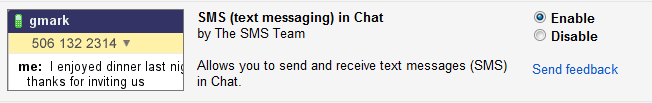 Step 1: Enable Gmark from Gmail Lab. Go to “Mail Settings” > “Labs” > “SMS (text messaging) in Chat” > Turn on “enable”.