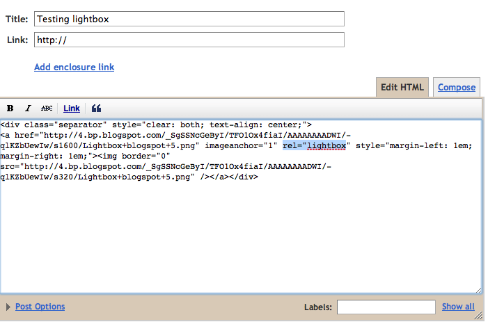 Now, when you have uploaded the photos while updating blog post, go to the Edit HTML mode and add rel=”lightbox” inside your < a href = “…. > hyperlink code. Each photo yea~~~
